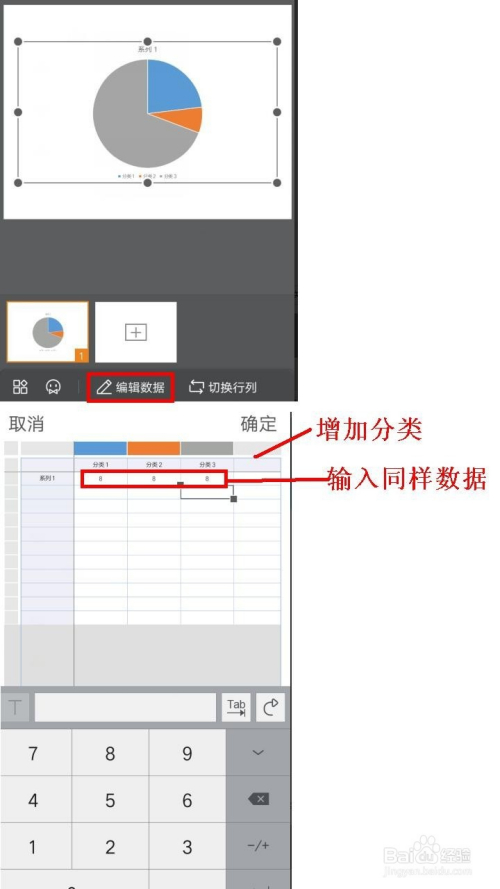 第五步,要建造等分饼图最关头一步就是编纂数据,点击编纂数据——呈现一个系列三个分类,每一个分类都输入不异的数据(若是分类多,就在后面列添加类别,也可以重定名分类名称)——点击确定。
