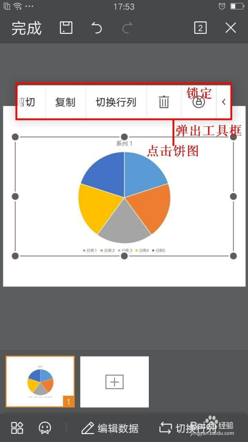 最后,点击一下饼形图,就可以呈现编纂东西,可以对图标编纂数据、复制剪切、切换行列(大都有多行多列数据时利用)、删除和锁定等
