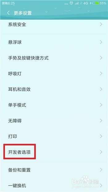 进入到更多设置界面后下拉界面,找到【开辟者选项】并点击。