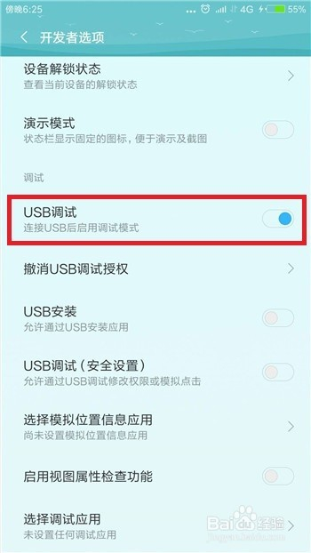 如许在打开开辟者选项界面后就能找到【USB调试】了,若是封闭的话需要点击打开。