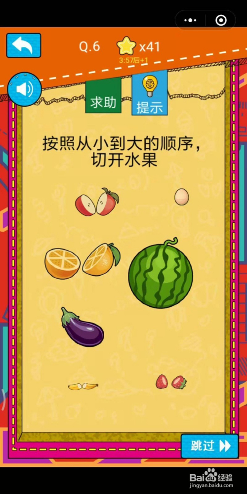 微信最壮大脑ol第6关攻略:切开生果,挨次是:喷鼻蕉-->草莓-->苹果-->橙子-->西瓜