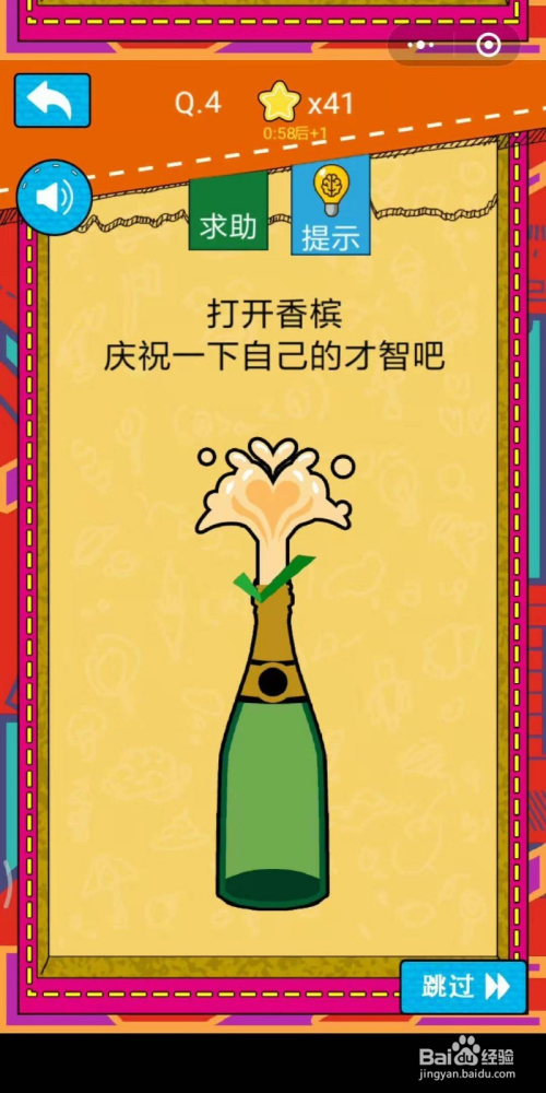 微信最壮大脑ol第4关攻略:摇摆手机至酒瓶出泡泡,然后标的目的上移动酒塞