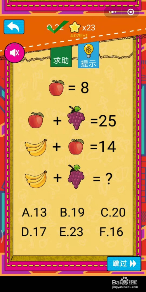 微信最壮大脑ol第22关攻略:点击上面的 22,第一题的葡萄比第三题的葡萄多一颗,所以谜底是 23-1=22