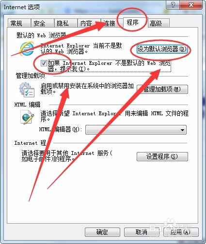 若是想把IE浏览器设置为默认浏览器,则选择法式选项卡,勾选若是IE不是默认浏览器提醒我选项前的钩,单击设为默认浏览器按钮。