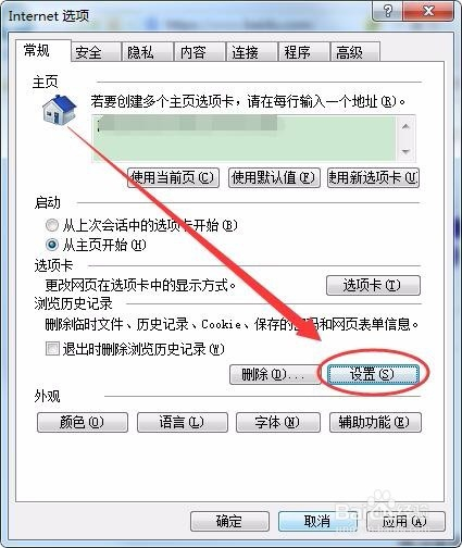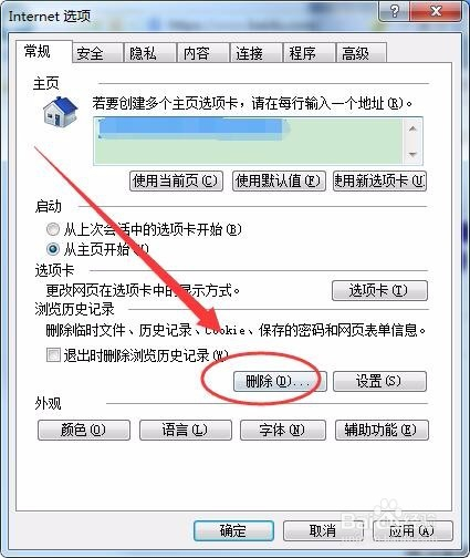 Internet选项窗口中,单击常规选项卡的删除按钮。