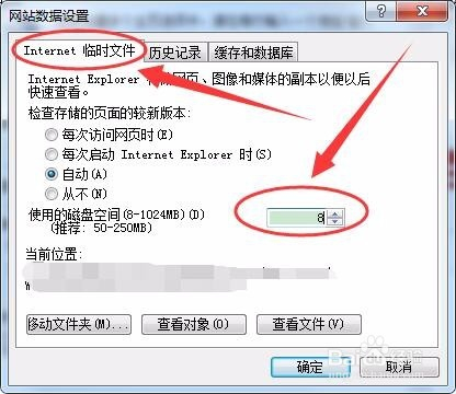 Internet姑且文件选项卡中,将磁盘空间设置为8M以下。