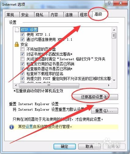 Internet选项窗口中,单击还原高级设置按钮。