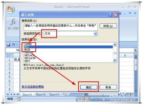 在弹出的“插入函数”窗口中,如图所示,别离选择类别为“文本”,函数为“mid”,点确定。该函数有三个参数,第一个参数是对操作的字符串,第二个暗示从第一个参数暗示的字符串什么位置起头操作,第三个参数暗示取第一个参数字符串多长内容。