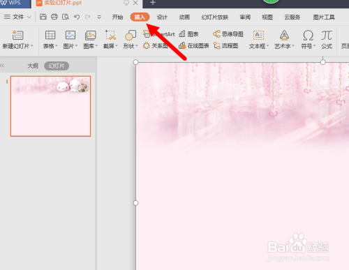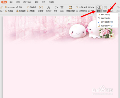 双击打开PPT文档,在上方东西栏找到“插入”按钮进行点击。紧接着在插入页面中点击右上方的“音频”按钮,继续点“嵌入音频”,如图。