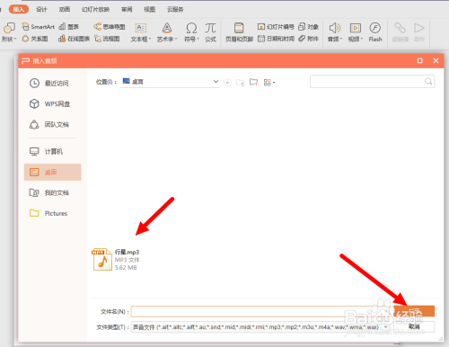 然后在插入音频的对话框中选择桌面上的音乐文件,点“打开”按钮进行插入。如图。