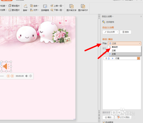 我们从“之前”、“之后”、“单击时”三个选项中选择单击时,如许在播放PPT时只有我们用鼠标点击页面才会播放音乐。
