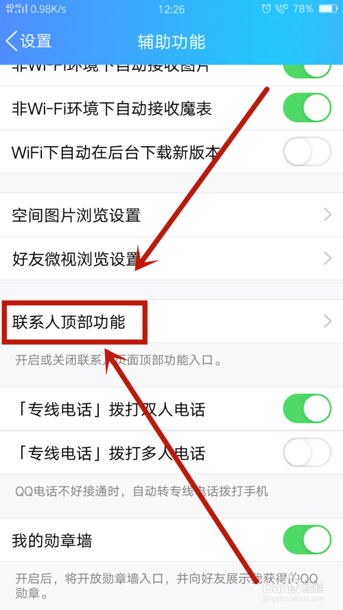 在QQ辅助功能中,点击联系人顶部功能,如图所示