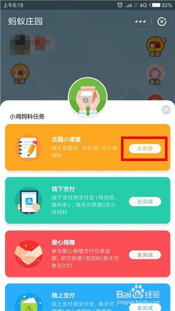在领饲料的使命界面中找到【庄园小讲堂】使命,接着点击【去答题】。