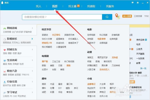 鼠标左键点击"加老友",进入到查找界面我们选择“找群”,如图所示;