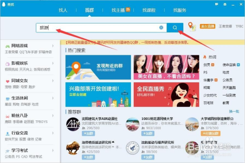 在搜刮栏中输入关头字,好比"旅游",然后点击“放年夜镜”进行搜刮,如图所示;