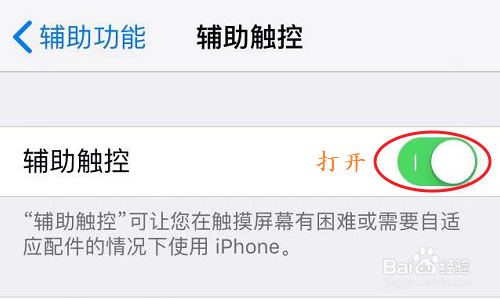 若是是新买的iPhone手机,那么开机今后这一项是处于封闭状况的,我们只需将辅助触控后面的开关调为开启即可;