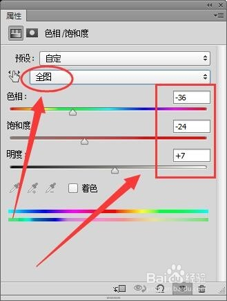 属性窗口中,设置全图的色相、饱和度和明度。