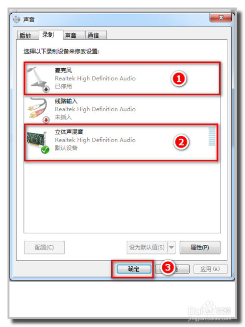 最后设置电脑的灌音设备为如图:立体声混音启用为默认设备,麦克风为停用状况。如许就可以只录制电脑发出的声音为语音源。