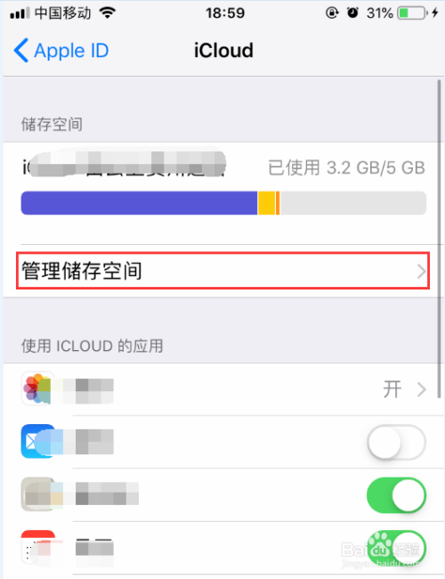 4.在iCloud中选择办理存储空间。