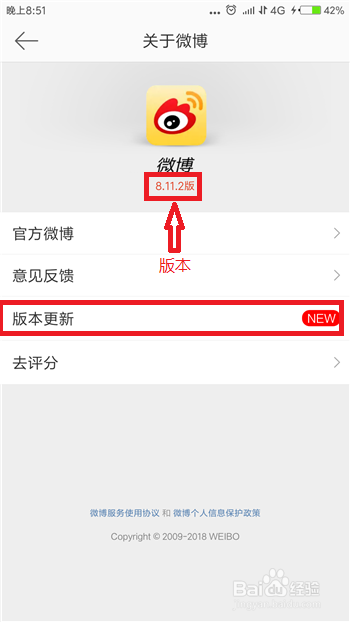 点击后会打开微博的详情界面,可以看到当前的版本号,想要更新的话点击【版本更新】。