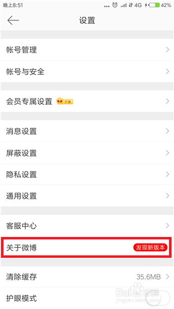 接下来在微博的设置界面中找到【关于微博】选项,后方会显示【发现新版本】,点击这个选项。