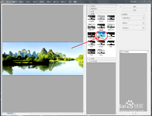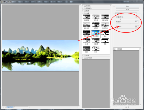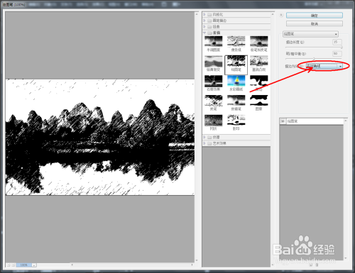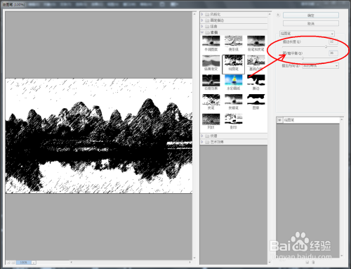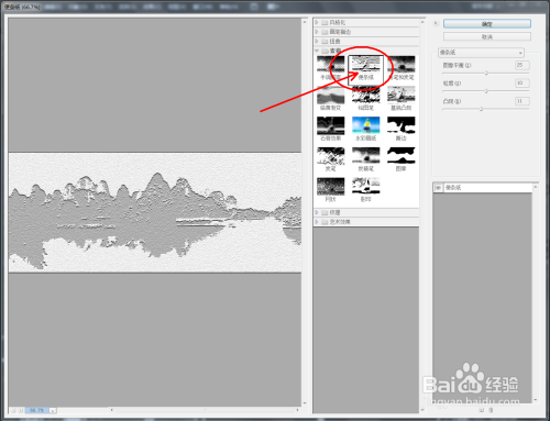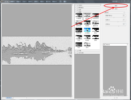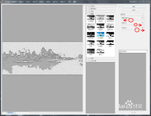 选中图片元素,点击【结果】-【素描】-【条子纸】,弹出条子纸设置框,按图示别离对【图像均衡】、【粒度】、【凸现】的参数进行设置,完当作后点击【确定】(如图所示);