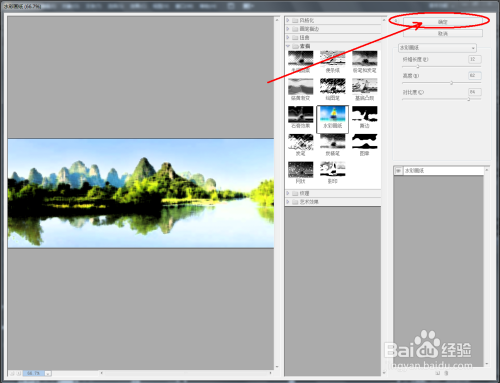 选中图片元素,点击【结果】-【素描】-【水彩画纸】,弹出水彩画纸设置框,按图示别离对【纤维长度】、【亮度】、【对比度】的参数进行设置,完当作后点击【确定】(如图所示);