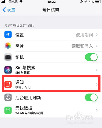 找到通知本家儿页下的第一项【许可通知】,将右侧的白色滑块往左滑动,封闭许可通知。