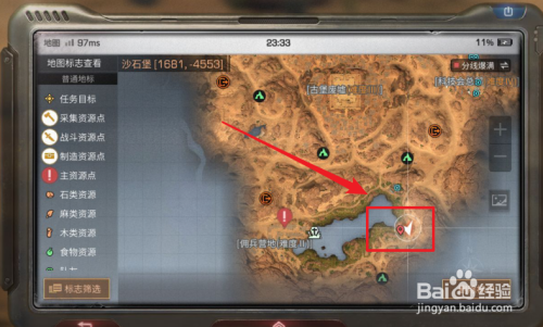 我们点击沙石堡的地图,找到绿洲地带。绿洲地带就是水域岸边。我们标注后,前去该地址。