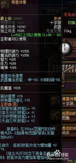 辅助奶爸选择十字架席蒿待罪;这是辅助奶爸极好的一把史诗兵器,对于没有神王十字架的奶爸来说,这是最好的选择!声誉祝福加5,醒觉技术天启之珠加2,是一把可以本身建造的史诗,不看脸,只看钱包,值得拥有!