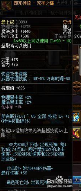 审讯奶爸请选择镰刀--即死贯通-死神之镰,很是高的三速加当作,对于腿短的审讯来说,刷图手感很是舒畅,还有44%的附加危险,5%的最终危险,不和其他危险冲突!对于那些没有圣耀兵器和超时空位狱兵器的审讯来说,也是不成多得的强力史诗!最主要的是,奶爸身背镰刀,真的很拉风,装逼指数10星哟!
