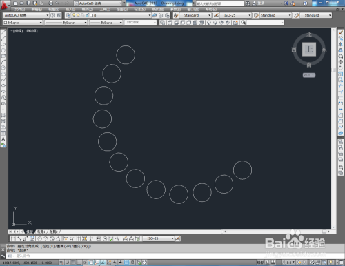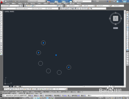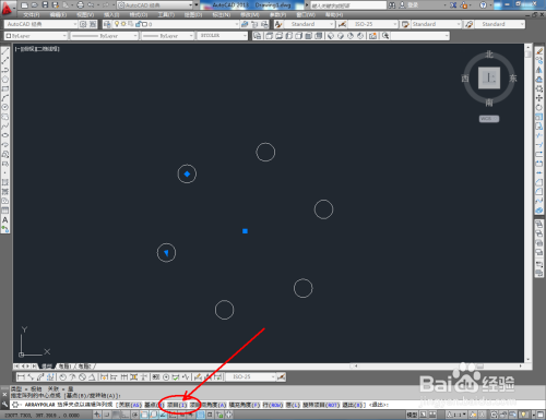 鼠标点击右边东西栏中的阵列东西不放,弹出阵列的三种选择模式,点击【环形阵列东西】。选中圆形图案,按下【空白键】,选择一个点作为阵列的中间点后进行阵列(如图所示);