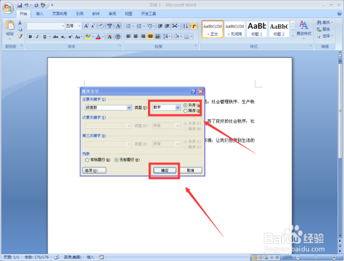 在“本家儿要关头字”栏下的“排序文字”对话框中,单击后面一个输入框后面的下拉按钮,选择此中的“数字”单击,其他选择默认