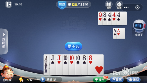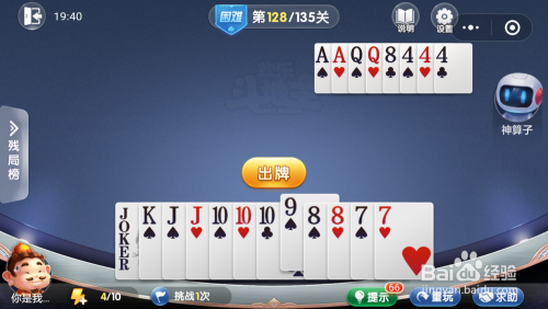 我打出三张10带一张小王,接着打出一对J一对8就过关了。