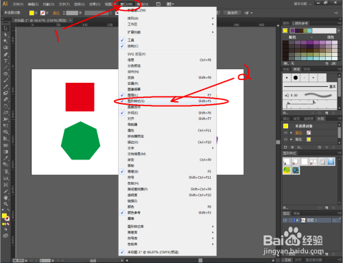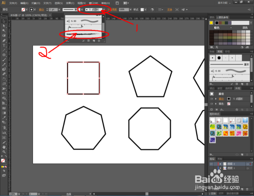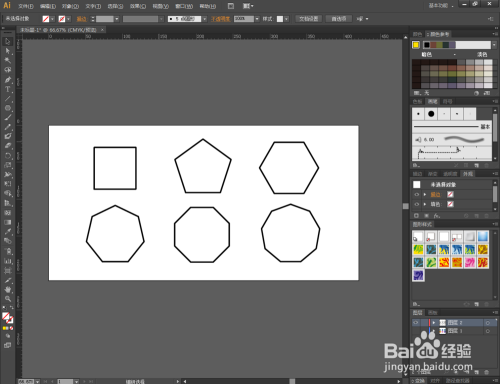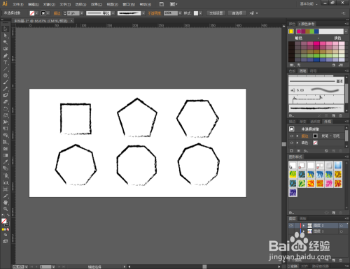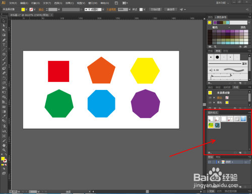 点击【窗口】-【图形样式】,弹出图形样式设置栏。点击设置栏左下角的【图形样式库菜单】,点击【Vonster图案样式】弹出图样样式选择框。别离为之前建造出来的多边形添加图形样式(如图所示);