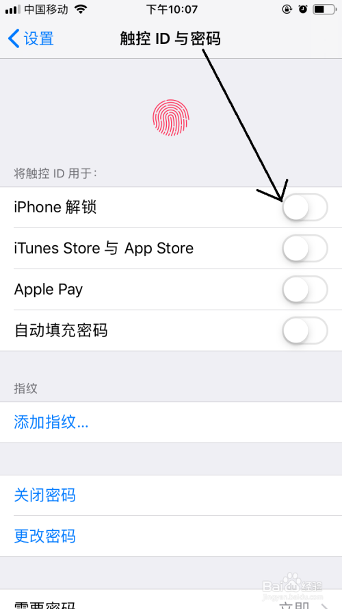 切换到触控ID与密码显示界面中的iphone解锁选项中点击开关按钮。