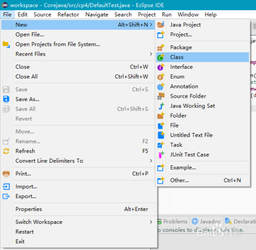 首先我们打开Java的IDE Eclipse,这里以常用的Eclipse软件为例,在一个建立好了的Java工程中,或者本身另行建立一个新的java工程项目,经由过程点击File-New-Class,即可新建一个通俗的Java类