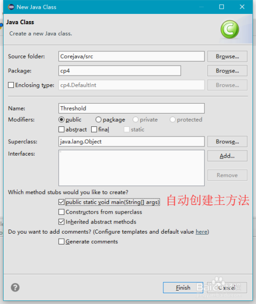 在弹出来的“New Java Class”新建类窗口中,可以对欲添加的Java类的类名和实现的接口进行界说,需要注重的是类名的定名要合适Java标识符的规范,如“Threshold”,并勾选主动建立本家儿方式