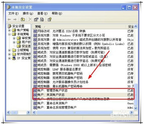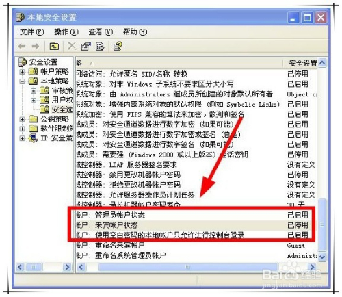 然后在打开的平安策略设置装备摆设窗口右侧,就可以对某一平安策略进行启用了。 操作方式:找到要启用的平安策略项,如帐户中的宾客用户状况。