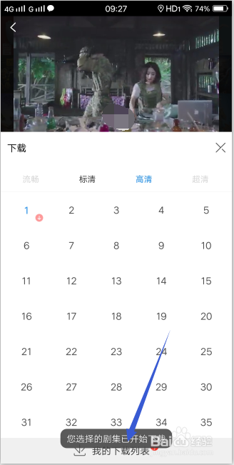 点击后,底部会显示【选择的剧集已起头下载】,点击底部的我的下载列表按钮。