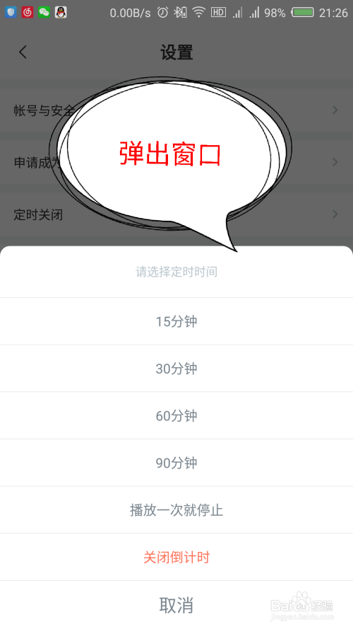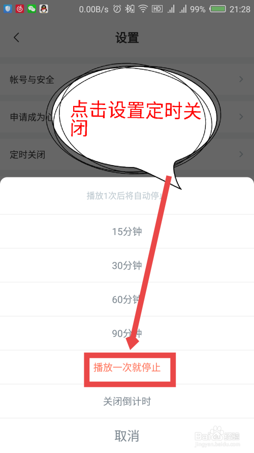 可以设置按时封闭倒计不时间,只能选择设置好的时候,或者设置播放一次就遏制。如图所示