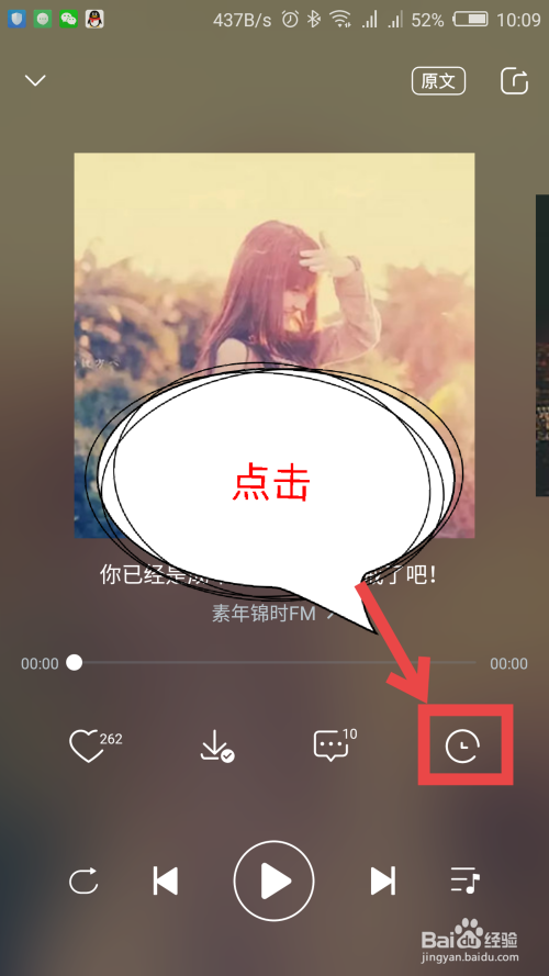 在节目音频播放详情界面,也是可以直接设置按时播放功能的,在右边有个时钟图标,就是按时选项,点击一下。如图所示