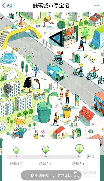 所谓寻宝就是在低碳城市中找到绿色低碳的场景,然后可以获得蚂蚁丛林的能力庇护罩,找到3个场景可以获得一个一天的庇护罩,10个场景可以获得2个一天的庇护罩,18个场景全数找到可以获得3个一天的庇护罩。