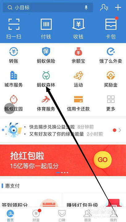 首先,打开手机中的付出宝,然后在付出宝的首页点击“蚂蚁丛林”图标,进入到蚂蚁丛林页面。