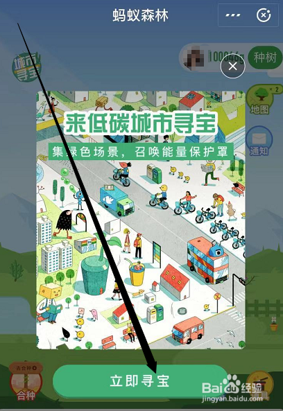 之后可以在蚂蚁丛林页面中小树苗的左侧看见有一个写着“城市寻宝”四个字的图标,这就是城市寻宝的活动进口。