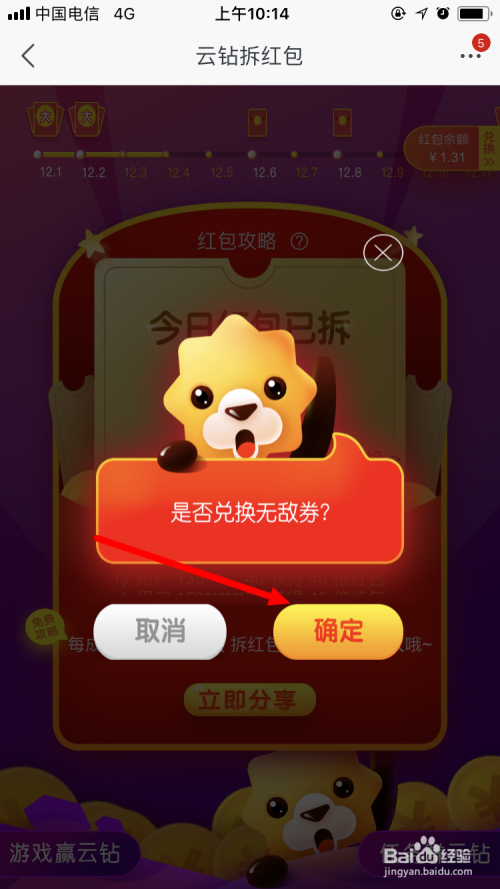 当我们获得的红包累计跨越1元时,就可以去兑换无敌券。首先点击 兑换 。