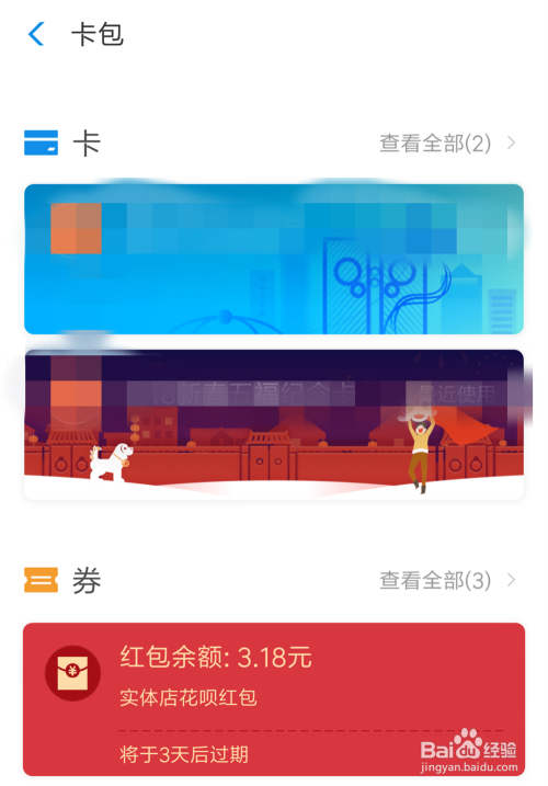 在付出宝首页右上角点击【卡包】选项,进入后在【券】组我们就可以看到花呗红包