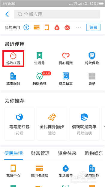 接下来在应用中找到【比来利用】,在比来利用中找到并点击【蚂蚁庄园】。