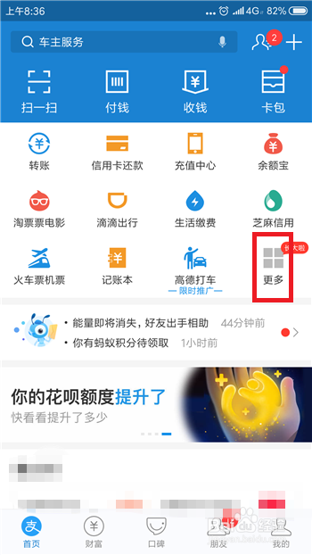 打开了付出宝今后找到顶部应用中的【更多】并点击。
