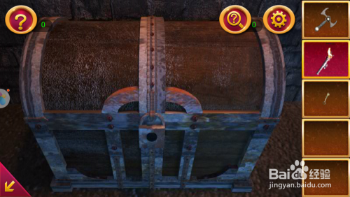操纵刚获得的钥匙,打开墙边上的宝箱,将宝箱里面的剑身拿起。